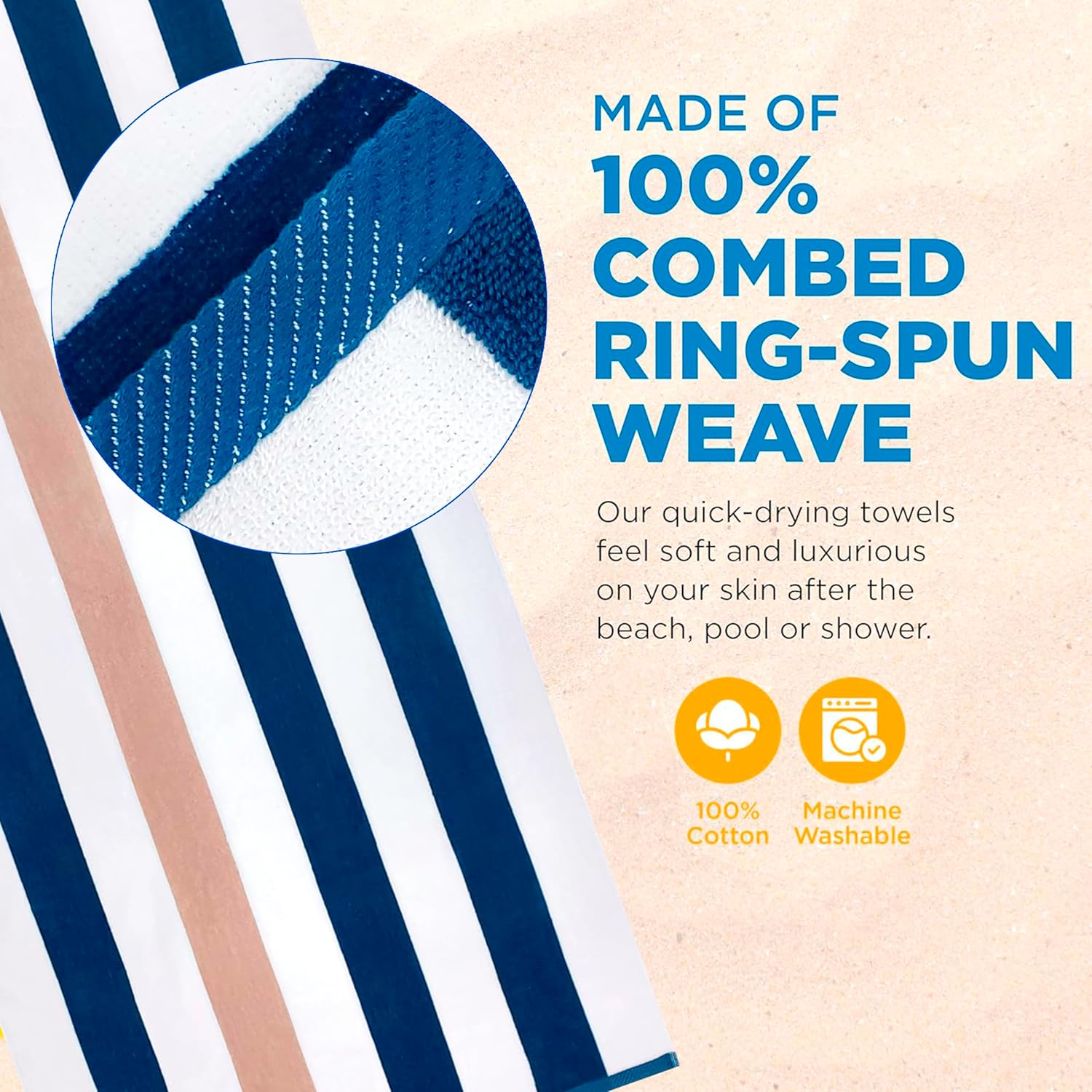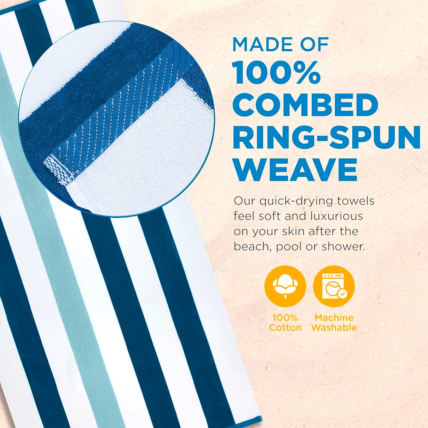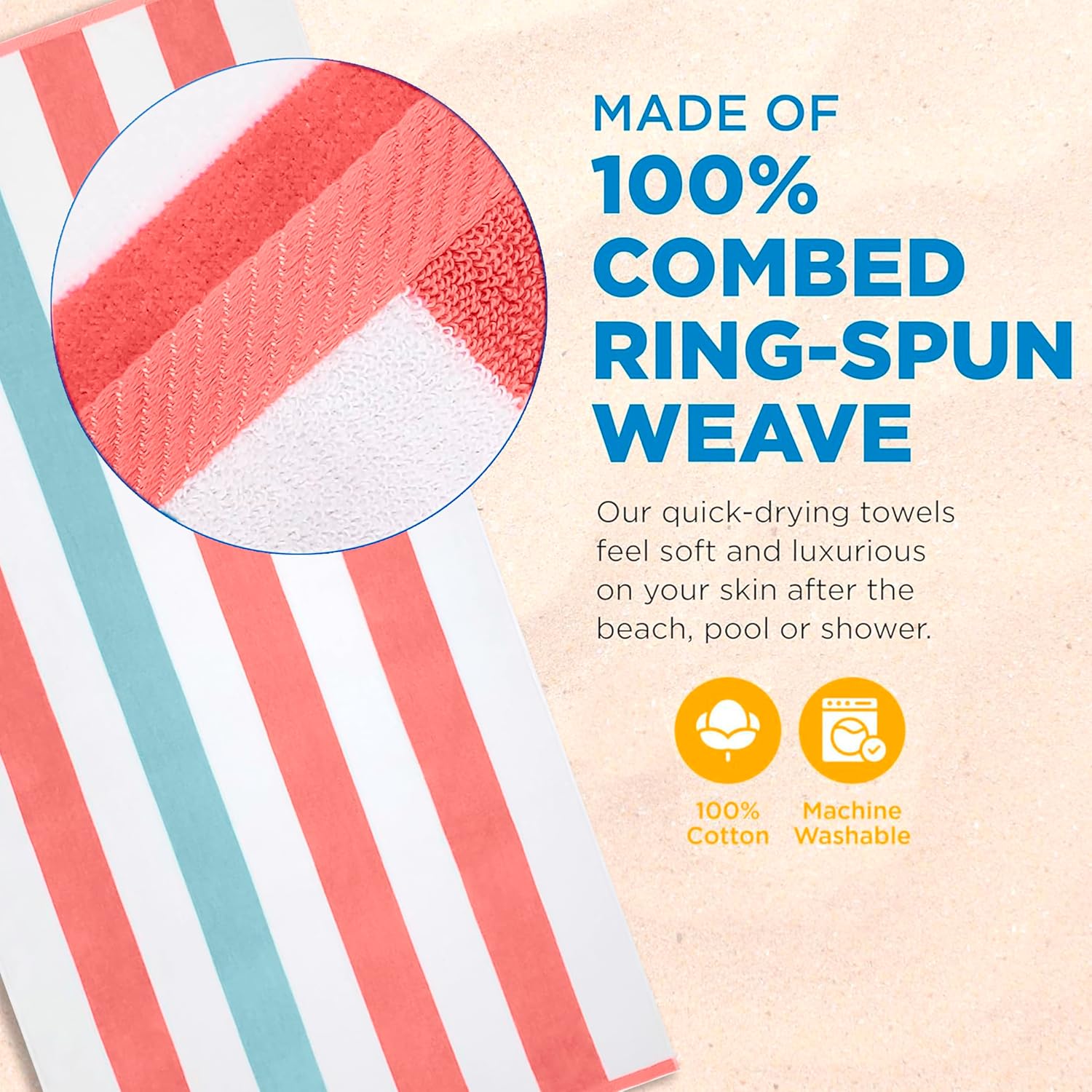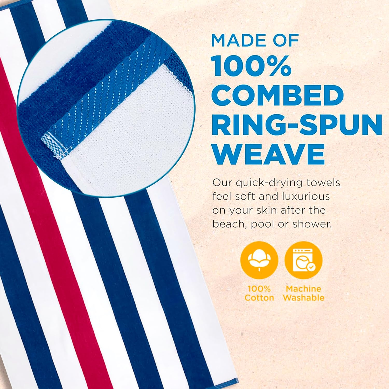 - LUXURY 100% RING-SPUN COTTON - Crafted from 100% combed ring-spun cotton, our thick, oversized beach towels provide a plush, spa-quality feel thanks to their thick, super-soft velour construction. Our towels come in vibrant colors that are long-lasting and won't fade. Available in a range of vibrant colors that resist fading, our striped beach towels combine style with durability for your perfect vacation companion.